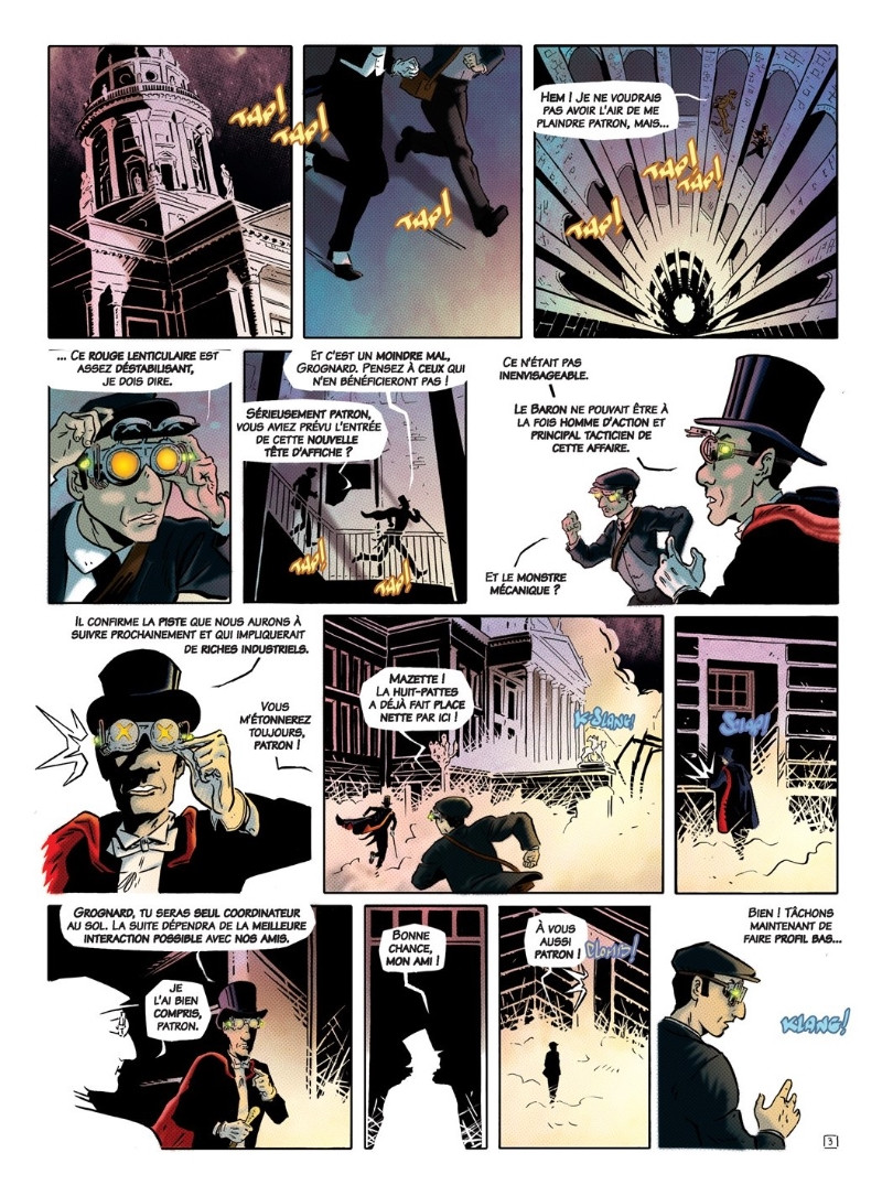 Mike Crocbart (scénario et couleurs) et Galien (dessin) poursuivent et achèvent l’aventure échevelée commencée avec L’Illusion de la Panthère Noire ! Sont à nouveau présents individus pittoresques et machineries steampunk, le tout issu d’un métissage entre l’œuvre de Maurice Leblanc et l’imaginaire narratif et graphique qui s’est cristallisé sur la période 1880-1920. De freaks en cabinets de curiosités, de science destructrice en idéaux vaguement humanistes, de zeppelins en bathyscaphes et de vols en affrontements, ce second volume continue l’histoire à un rythme effréné.