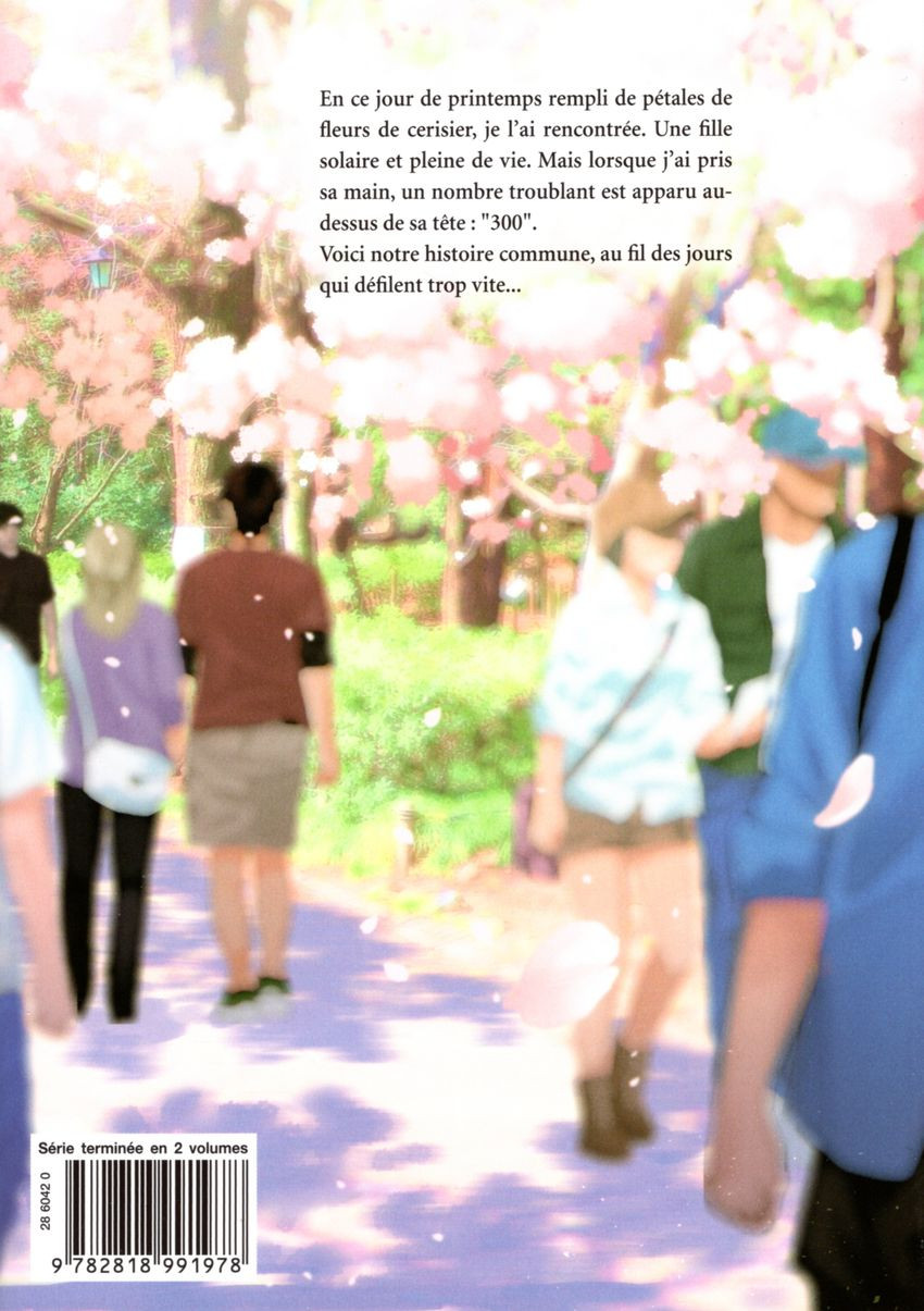On pourrait se dire que c'est encore une histoire d'amour à l'eau de rose mais en fait, pas vraiment car notre héros va tomber amoureux d'une fille qui n'a plus que 300 jours à vivre en raison de sa maladie incurable qui a déjà emporté son père. Bref, c'est plutôt un drame bouleversant, une romance tragique sous les cerisiers en pleurs. Les thèmes principaux sont la mort, la maladie ainsi que la résilience avec deux personnages principaux qui emportent tout sur leur passage, chacun à sa manière. Le combat face à la maladie sera une chose difficile à vivre. Il y a également un côté qui rend assez touchant ce récit d'amour même si parfois les ficelles paraissent assez visibles. C'est vrai qu'on commence avec une espèce de compte à rebours car on sait que la personne aimée va disparaître de ce monde. Pour autant, notre héroïne Miu croque la vie à pleine dent avec un courage absolument extraordinaire. Pour lui, plus les jours passent et plus c’est difficile. Il s'efforcera malgré tout de rendre les jours restants meilleurs que les précédents afin d'apporter du bonheur. Leur duo fonctionne à merveille avec ce qu'il faut de retenue. Le graphisme reflète de la douceur avec une innocence qui reste parfaitement visible. Cela rend cette lecture encore plus attendrissante. C'est tout doux et c'est rempli de bons sentiments. La vie est parfois cruelle avec certaines personnes. Cependant, au final, elle mérite d'être vécue pour le message qu'elle laisse. C'est évidemment une bien belle leçon de vie sans vouloir tomber dans la morosité. Au final, cette magnifique histoire en deux tomes devrait ravir les fans de manga romantique.Le 02/05/2022 à 22:02:42