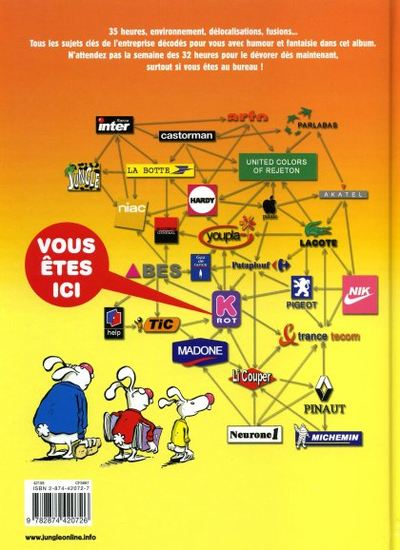 Ça se passe comme ça à la K.rot. Les yeux rivés sur les trends, des lapins s’affairent à simuler des négociations à l’issue connue d’avance, à jongler avec la variable salariée puisqu’on ne peut plus influer sur le cours des matières premières, à cherche des débouchés à des produits qui restent à créer. Et il faut bien avouer que, vu de l’extérieur, c’est vraiment marrant. On peut se délecter du cynisme souriant qui baigne l’ensemble de ces gags en une planche, sans la pointe d’acidité coutumière au genre. En fait, on a probablement plus souvent vécu les scènes où les lapins à cols blancs s’échinent à justifier leur utilité dans la boîte que celles où Dilbert est confronté à ses clients exotiques. Question de culture sans doute.