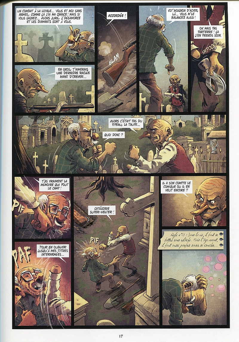 Absolument excellent. Un dessin sublime et exquis un récit alambiqué à la "Le Bon, la Brute et le Truant". Un papi qui perd un peu la boule à la fois un grand téméraire et courageux bandit... "Pas con l'vieux" A découvrir sans aucune hésitation. Si on commence on ne s'arrête plus... Seule bémol, les chapitres à l'envers, c'est bof !!!! Si les auteurs ont voulu que l'histoire se lise à l'envers et bien c'est raté et ce n'est surtout pas assez adapté au scénario. Je les ai lu dans l'ordre en lisant les chapîtres à partir de la fin. Et c'est un peu plus compliqué que ça... Dommage. J'aurais donné 5 étoiles tellement j'ai aimé. De plus il y a pas mal de planches.Le 23/06/2019 à 19:49:17