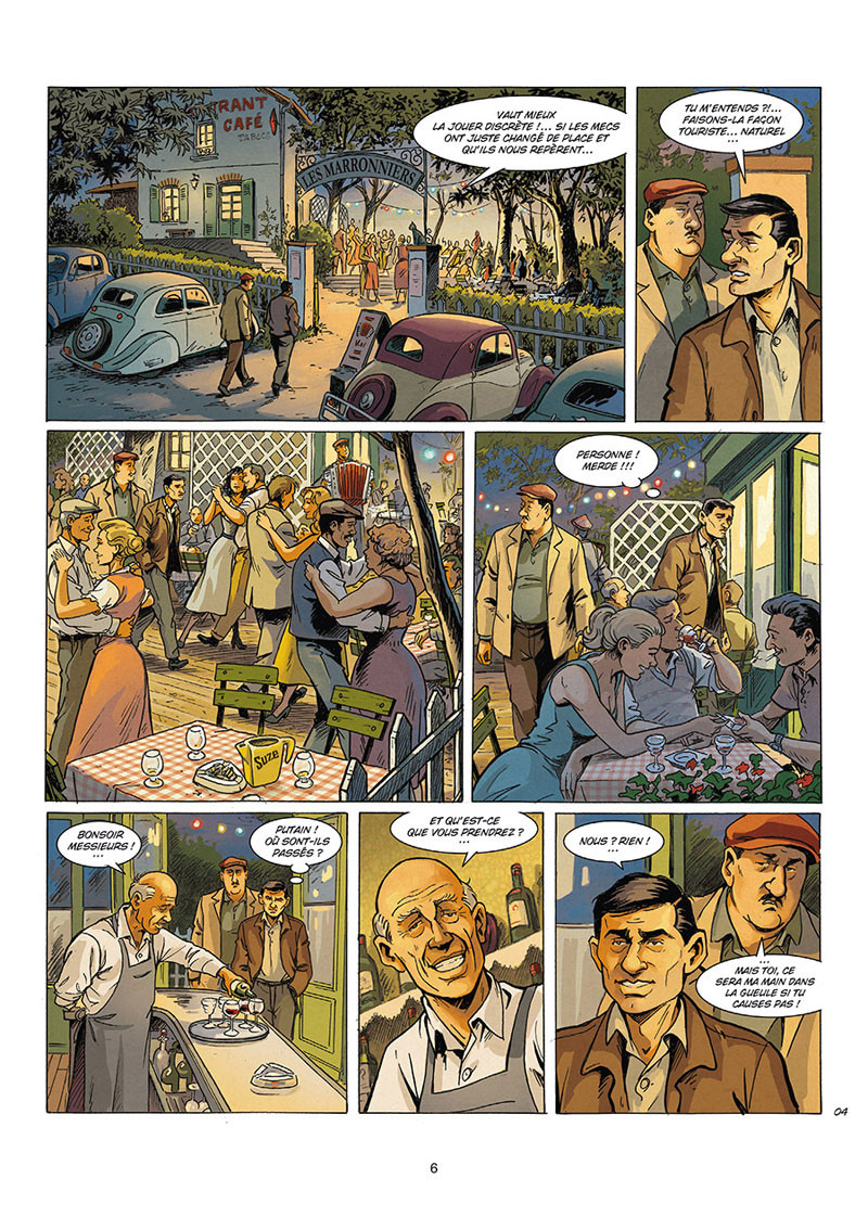 Rodolphe et Gaël Séjourné clôturent avec élégance À la vie et à la mort !, triptyque retraçant la vie tumultueuse de Pierrot le fou. Comme dans les autres tomes de la série, ce troisième album regarde vers le passé et retrace des étapes qui ont mené le meurtrier à son trépas. Petite nouveauté, la narration lorgne également vers les années qui ont suivi la mort du gangster. En effet, le scénariste n’a pas oublié le reste de la bande et détaille le devenir de cette brochette de malfrats. Il élargit ainsi son propos et dresse un portrait plus général du monde interlope français des années trente et quarante, une génération traversée par la Guerre et l’Occupation. Soigneusement réalisé et s’offrant même quelques petits clins d’œil au cinéma et à la littérature de l’époque, l’ouvrage s’avère efficace et agréable à parcourir. Également positives, les couleurs chaudes et très bien dosées de Jean Verney renforcent l’excellente atmosphère générale de cette biographie.