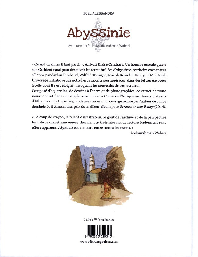 L'Abyssinie, territoire de la Corne d'Afrique, chevauchant l'Éthiopie, l'Érythrée et le Soudan, a attiré explorateurs et poètes depuis des siècles. Rimbaud, Thesiger, Monfreid, Kessel... Ils ont tous été happés par ses paysages de plaines et de hauts plateaux, et ses promesses d'aventures sur des zones encore vierges de toute civilisation urbaine. Caravaniers et marchands, déambulant sur des territoires occupés par des peuples guerriers, s'installant dans des cités fortifiées au cœur de l'Abyssinie, ethnologues improvisés, écrivains idéalistes, s'alarmant d'une mondialisation dévorante, ils ont inspiré Joël Alessandra tout au long de son parcours.