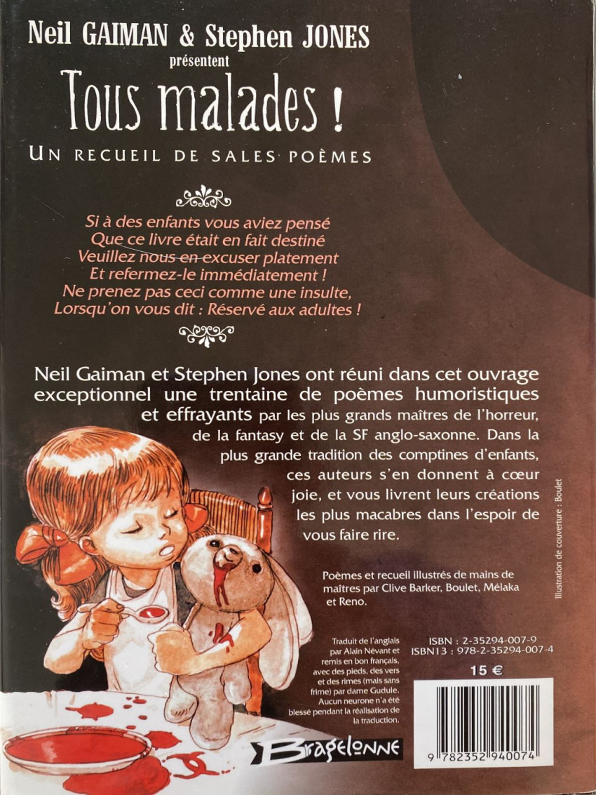 Info édition : Recueil de poèmes de Neil Gaiman & Stephen Jones illustré par Boulet, Reno et Mélaka. Dessin de la jaquette boulet, dessin couverture Clive Barker.