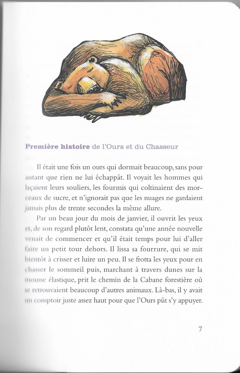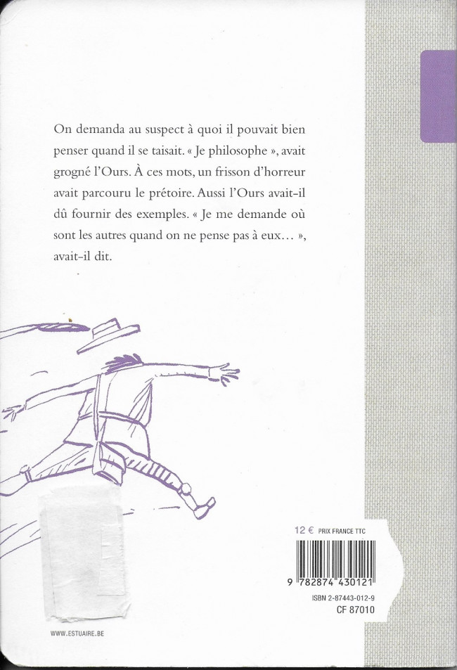 Résumé: On demanda au suspect à quoi il pouvait bien penser quand il se taisait. "Je philosophe", avait grogné l'Ours. A ces mots, un frisson d'horreur avait parcouru le prétoire. Aussi l'Ours avait-i dû fournir des exemples. "Je me demande où sont les autres quand on ne pense pas à eux...", avait-il dit.