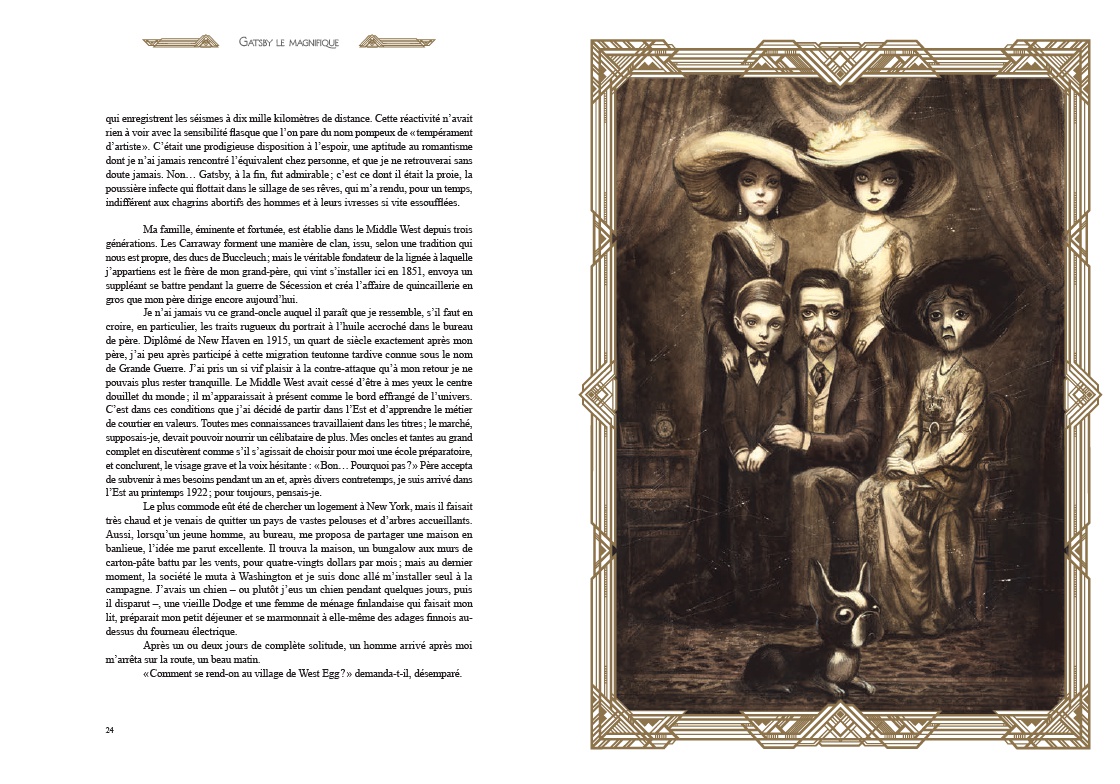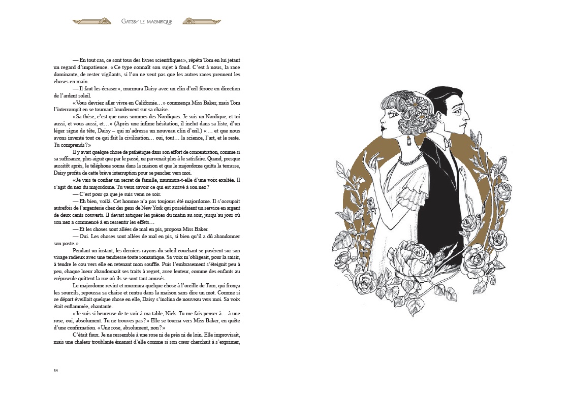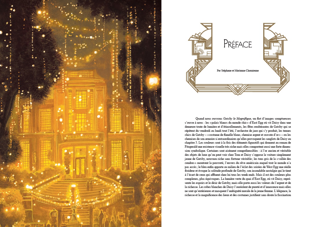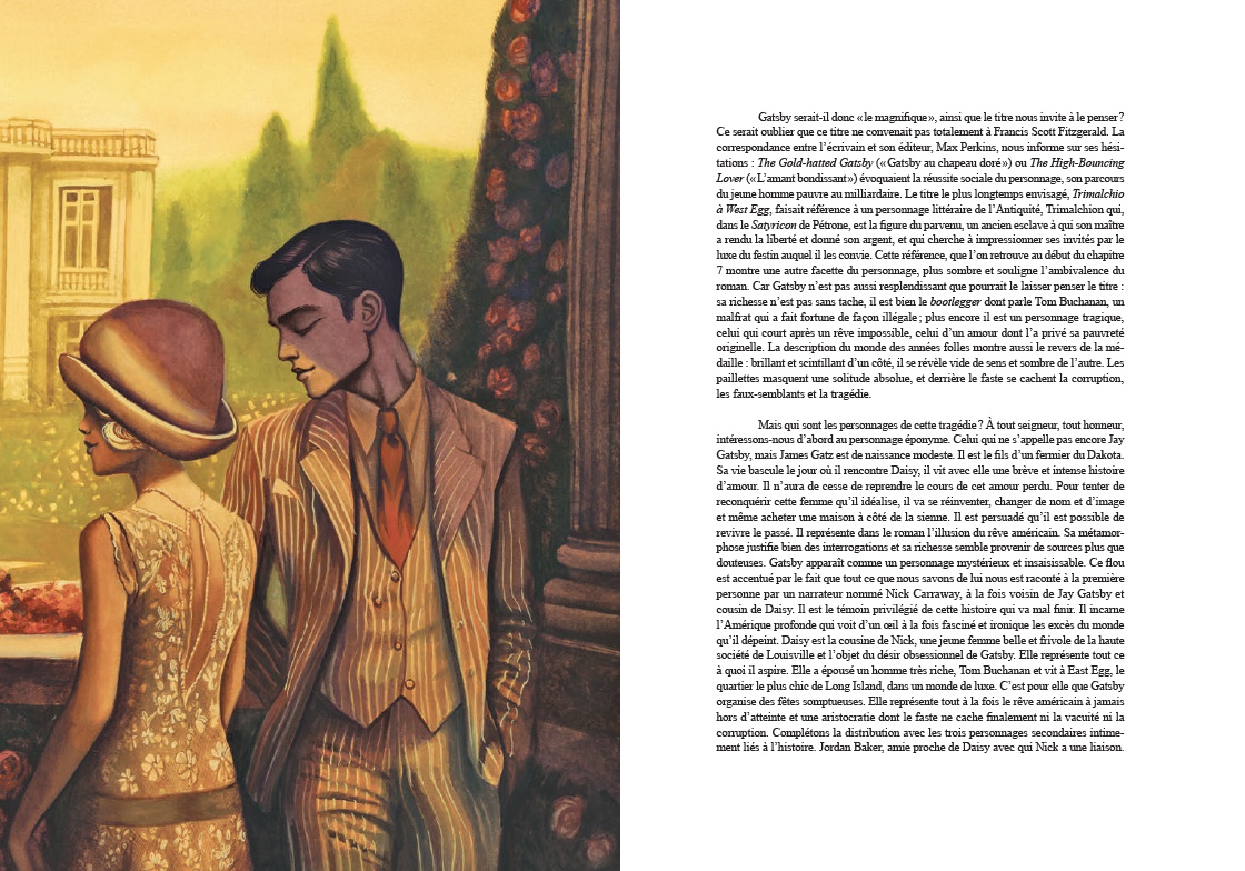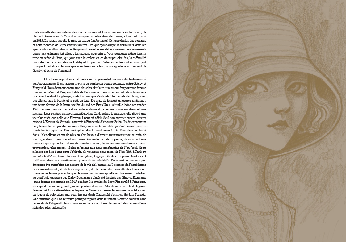 Résumé: Chef-d'oeuvre de la littérature américaine, Gatsby le Magnifique devient, sous le pinceau de Benjamin Lacombe, une fresque visuelle d'une rare intensité. L'élégance fiévreuse de Fitzgerald s'incarne dans des images où l'or et l'ombre valsent au rythme du jazz. À travers les yeux de Nick Carraway, jeune narrateur désabusé, se dessine le portrait du mystérieux Jay Gatsby, millionnaire romantique. Son amour absolu pour Daisy, ses fêtes flamboyantes et son destin brisé révèlent les illusions perdues de la génération des Années folles, entre faste et vertige. Benjamin Lacombe magnifie ce roman culte avec des illustrations d'une force dramatique rare : silhouettes élancées, décors Art déco, paysages intérieurs aux teintes crépusculaires. Chaque image prolonge l'ambivalence du texte - entre éclat et désillusion, rêve et mensonge. En miroir, une narration graphique retrace le destin de Zelda et Scott Fitzgerald, amants terribles et reflets poignants de leurs avatars littéraires : Daisy Buchanan et Jay Gatsby. Pensée comme un objet d'exception (avec un dépliant sculpté), cette édition explore les failles d'un monde fasciné par la richesse. Un conte moderne aux reflets d'or et de nuit.