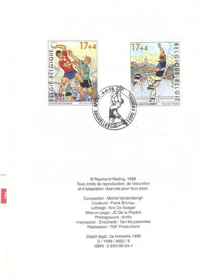 Info édition : Album édité par le Centre Belge de la Bande Dessinée et La Poste belge à l'occasion de la Coupe du Monde de football 1998 et de l'émission d'une série de timbres dessinés par Raymond Reding consacrés aux jeux de balle. Outre une biographie de l'auteur, cet album reprend deux histoires recolorisées de Raymond Reding : "Un match en trop" (Vincent Larcher) et "Au doigt... à l’œil... au sifflet !" (une aventure de la Section R).