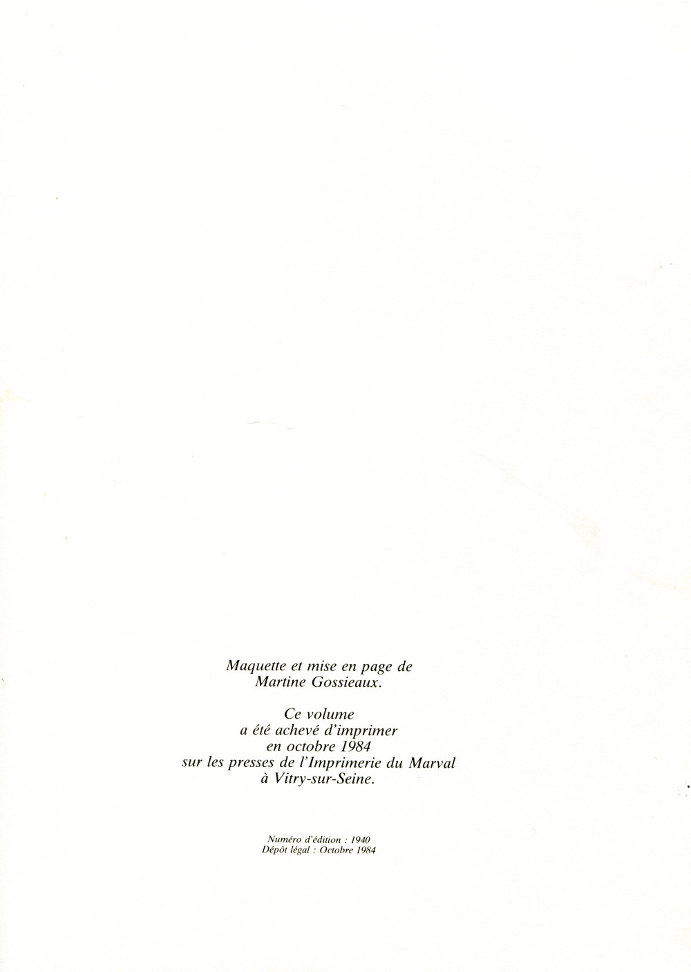 Prix de vente 49,50 francs. Format 27 x 21,4 cm. Dans les mentions légales, la D.L. et l'impression sont datées d'octobre 1984 alors qu'au verso il est indiqué 4.84. Couverture avec rabats.