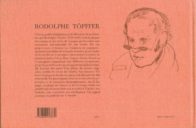 Résumé: Des "Hsitoires en estampes" comme les désignait lui-même leur auteur, Rodolphe Töpffer (1799-1846). En fait, l'origine de la bande dessinée. Ici les aventures cocasses de Mr Trictrac, brave bourgeois qui décide de partir à l'aventure pour découvrir les sources du Nil dans un flot de quiproquos et situations. abracadabrantes.