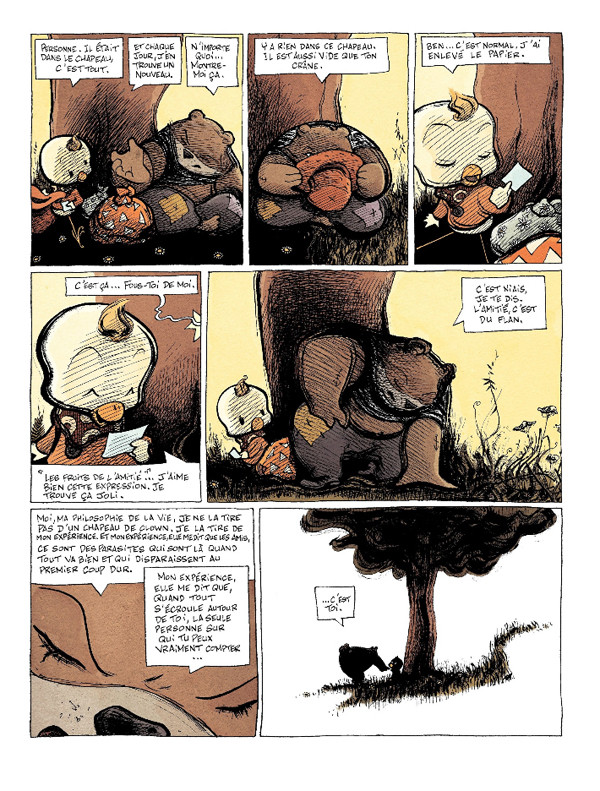 Résumé: Quand Abélard, un poussin rêveur, tombe amoureux d'une jeune fille, que peut-il faire pour la séduire ? Décrocher la lune, par exemple. Le voilà en chemin pour le Nouveau Monde, avec son banjo et son chapeau à proverbes. Il a entendu dire qu'en Amérique, on a inventé une machine volante. Pour décrocher la lune, c'est sûr, il n'y a pas mieux ! Durant ses pérégrinations en compagnie de Gaston, l'ours grincheux mais généreux, il va découvrir la vie, la vraie, celle qui ne ressemble pas toujours à nos rêves. Mais Abélard ne sera pas toujours là pour tenir compagnie à Gaston. Celui-ci fera la connaissance d'Alvin, un orphelin pas commode avec lequel il va de nouveau tailler la route. Entre absurde et poésie, les diptyques Abélard et Alvin, réunis ici dans une édition intégrale, forment un roman graphique pour les âmes sensibles et les coeurs tendres. Le texte de ce conte philosophique nourri des dialogues savoureux de Régis Hautière est relayé à merveille par le dessin tout en rondeurs de Renaud Dillies.