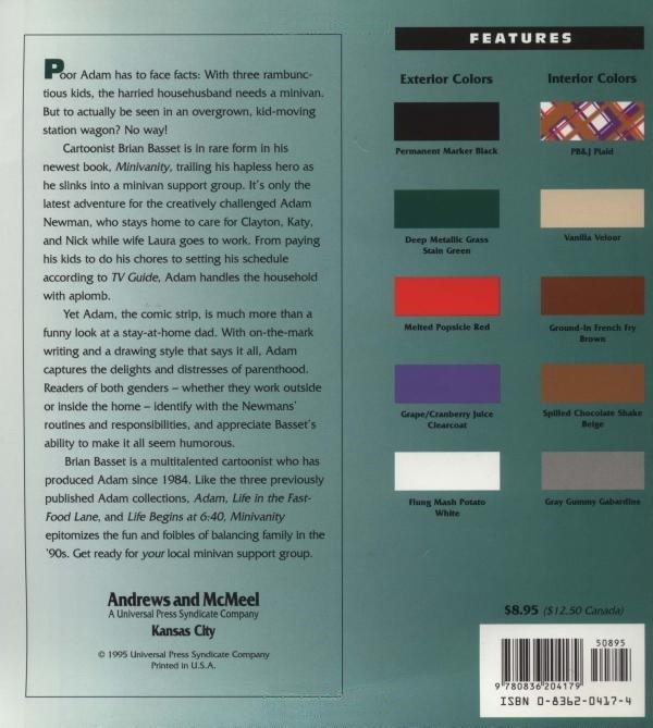 Résumé: Cartoonist Brian Bassett is in rare form in his newest book, Minivanity, trailing his hapless hero as he slinks into a minivan support group. It's only the latest adventure of the creatively challenged Adam Newman, who captures the delights and distresses of early parenthood. Readers of both genders -- whether they work outside or inside the home -- identify with the Newmans' routines and responsibilities, and appreciate Bassett's ability to make it all seem humorous.