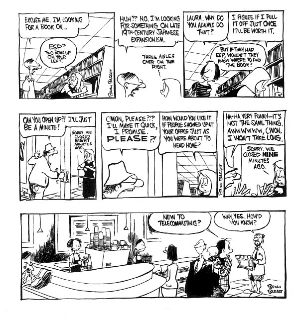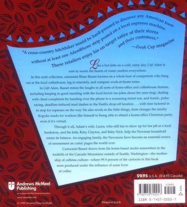 In this sixth collection, the one-time Mr. Mom focuses on a whole host of compatriots who hang out at the local coffee café, log in remotely, and compare work-at-home notes. In Café Adam, an all-new Adam@home collection, Basset mines the laughs in all sorts of home-office and coffee-house-based dramas, including keeping in good standing with the local barista (no jokes about the nose ring), dealing with client complaints by handing over the phone to a screaming infant son, and helping out his kids' class at school. He also revels in the little things, from changes the nearby Kopyko made for workers like himself to being able to attend an office Christmas party, even if it's virtual.Through it all, Adam's wife, Laura, who still has to show up for her job at a local bookstore, and his kids, Katy, Clayton, and Nick, help the Newman household retain its balance. An engaging family, the Newmans have become an essential source of amusement for Basset's countless fans.