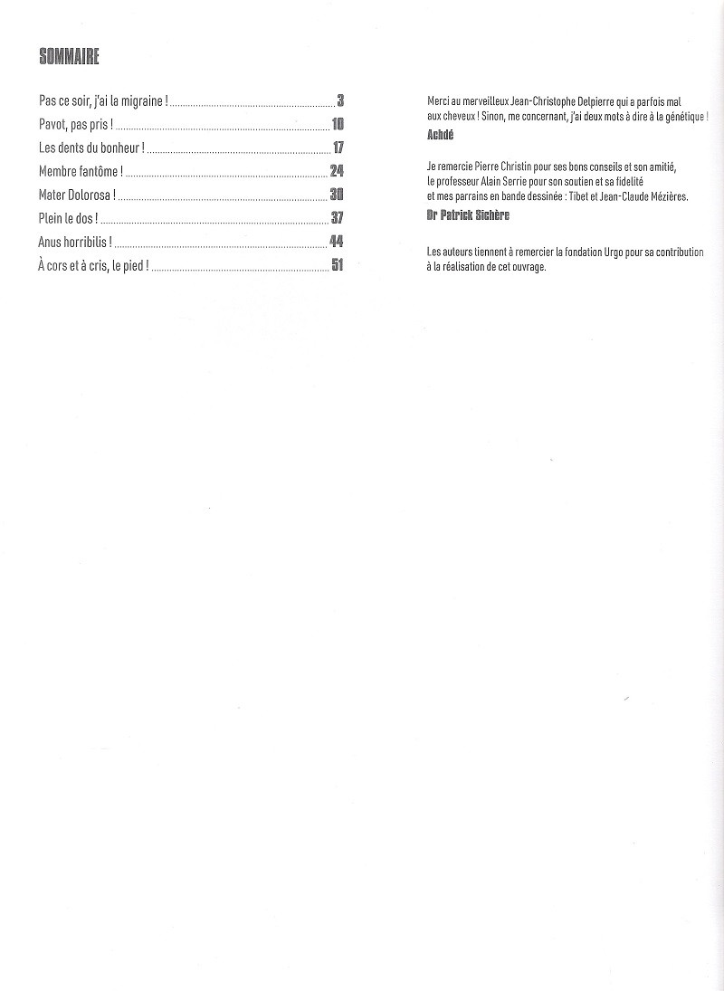 lgologue : médecin spécialisé dans la prise en charge de la douleur. Patrick Sichère (le pro de l’équipe) et Achdé (le bédéaste de garde) se sont associés pour parler, dans la bonne humeur, de cette affliction que tout le monde a, un jour ou l’autre, endurée.