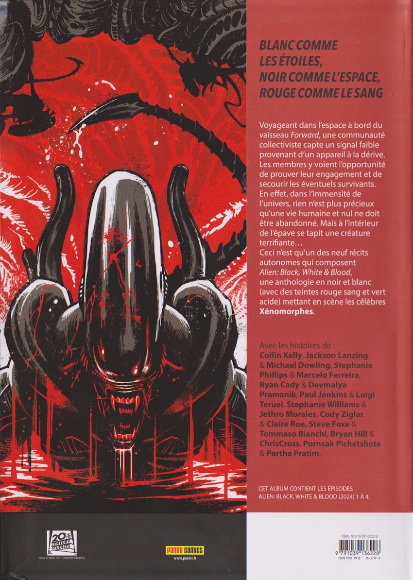 Info édition : Contient les épisodes US inédits : Alien : Black, White & Blood 1-4. En début d'album, 2 pages de couvertures variantes et en fin d'album, 4 pages de couvertures variantes. Il existe une édition collector avec l'ISBN 979-10-391-3623-5.