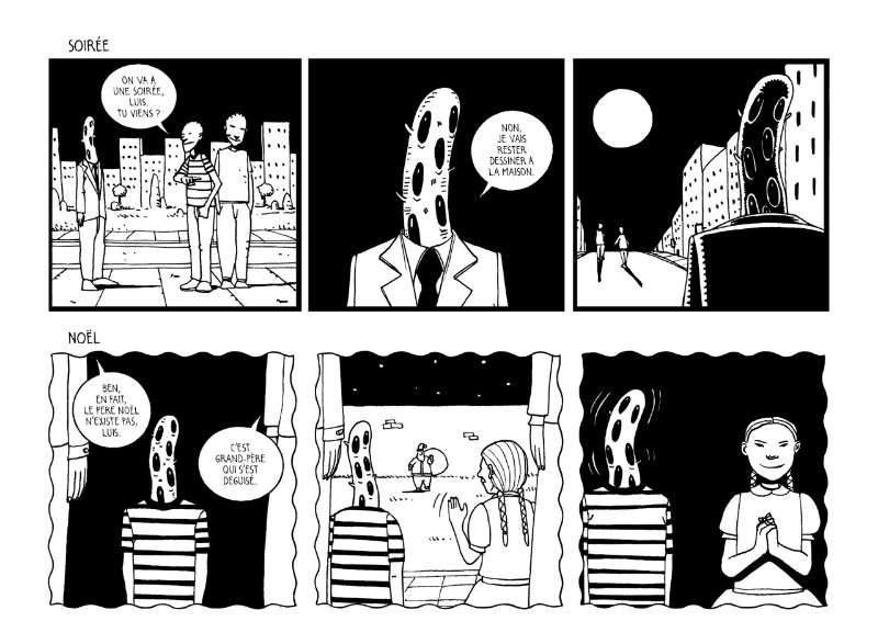 vec sa tête végétale truffée d’yeux ovales tous noirs, Luis a une bonne face d’alien. Est-ce la raison pour laquelle sa vie est à ce point terne et dénuée de relations sociales ? Ses rapports avec les filles sont presque inexistants, la faute à une timidité quasi maladive, son avenir de dessinateur est des plus flous et ses amis… indifférents, voire absents.