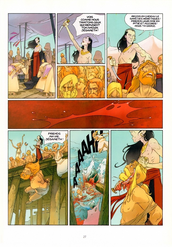 Premier tome de haute volée où le fanatisme religieux, dans la pure bêtise que l’on peut lui connaître, empêche l’innocence de l’enfance de s’émerveiller. Alim doit faire avec sa fille Bul qui comme tout enfant a soif d’apprendre. Mais cela ne plait pas à tout le monde et surtout aux admirateurs de Jesameth et au commissaire janissaire Reinkhol. J’adore la fraicheur de cette BD ainsi que son héros Alim duquel émane la sérénité et la bonté. Le beau père d’Alim n’est pas en reste en pépé espiègle. La petite famille unie, le pépé, Alim et Bul vont pouvoir échapper à la bêtise ambiante et fuir la cité de Bramhalem où ils ne sont plus en odeur de sainteté. Le graphisme proposé par Virginie Augustin me plait énormément. Elle a un talent énorme qu’elle a démontré récemment dans un « one shot » de Conan.Le 14/03/2015 à 15:33:12