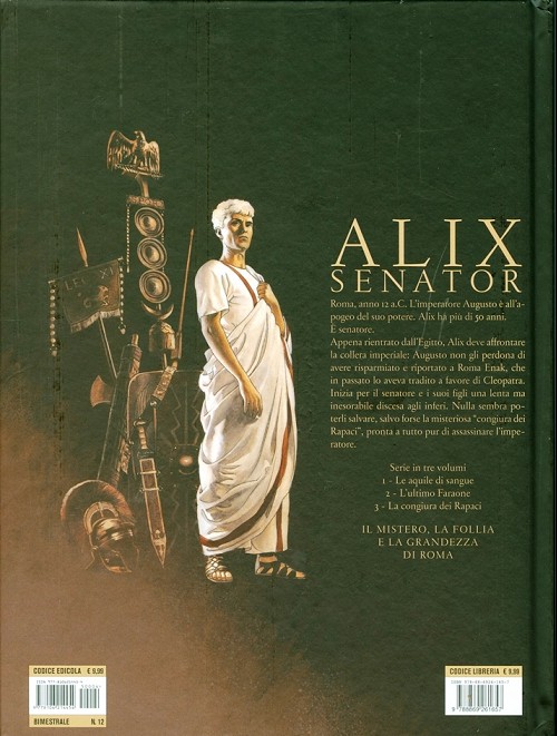 Au même moment, tout juste revenu d’Égypte d’où il a ramené son vieux compagnon Enak donné pour mort, Alix Graccus doit affronter une succession de graves déconvenues. Considéré comme un traître ennemi de Rome, Enak est arrêté sur ordre de l’empereur, tandis que le courroux d’Auguste s’abat sur Alix, bientôt menacé d’être déchu de son statut de sénateur et de perdre tous ses biens. C’est le moment que choisissent les ennemis d’Auguste pour proposer à Alix de rejoindre leur conjuration ; ils parviennent même, à la faveur d’une profonde crise d’adolescence, à rallier à leur cause le jeune Khephren, le fils d’Enak devenu le fils adoptif d’Alix…