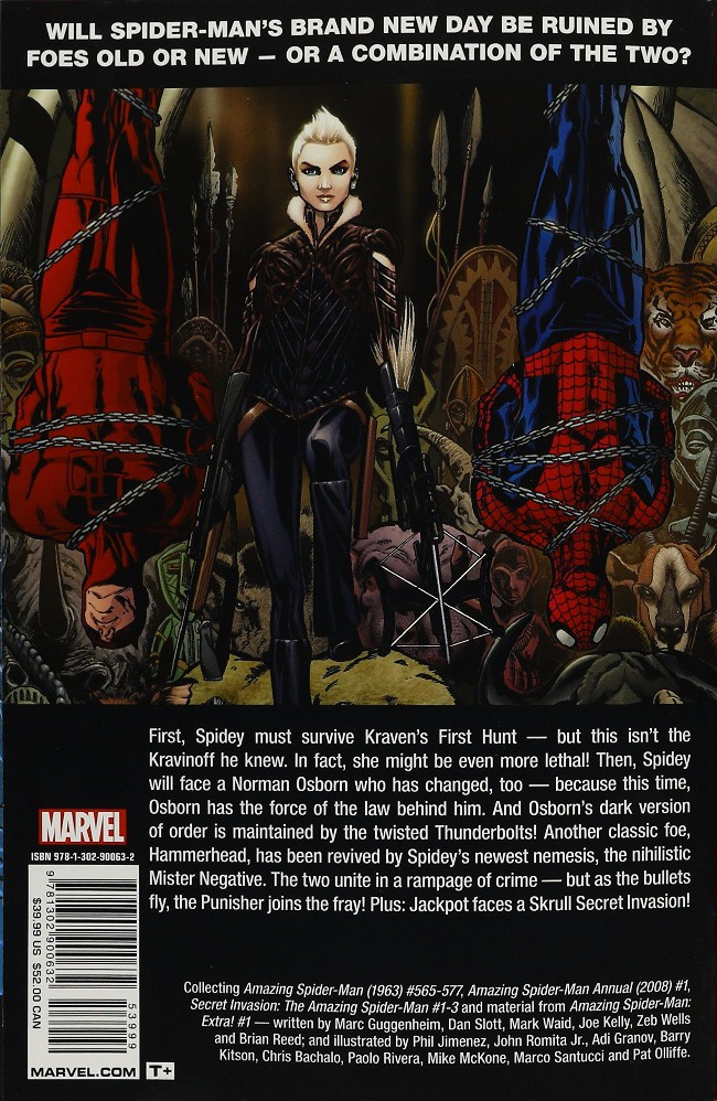 Résumé: Will Spider-Man's Brand New Day be ruined by foes old, new, or a combination of the two? First, Spidey must survive Kraven's First Hunt - but this isn't the Kravinoff he knew. In fact, she might be even more lethal! Then, Spidey must face a Norman Osborn who has changed too - because this time Osborn has the force of the law behind him. And his dark version of order is maintained by the twisted Thunderbolts!