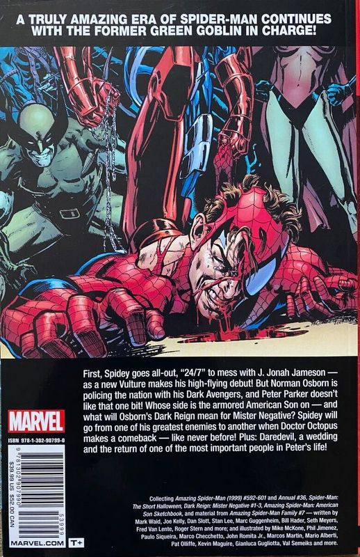 Info édition : Volume 4 - 1st printing. Collects Amazing Spider-Man (1998-2014 2nd Series) #592-601 and ANNUAL #36, Spider-Man: Short Halloween (2009), Dark Reign: Mister Negative (2009) #1-3, AMAZING SPIDER-MAN: AMERICAN SON SKETCHBOOK, and material from Amazing Spider-Man Family (2008) #7.