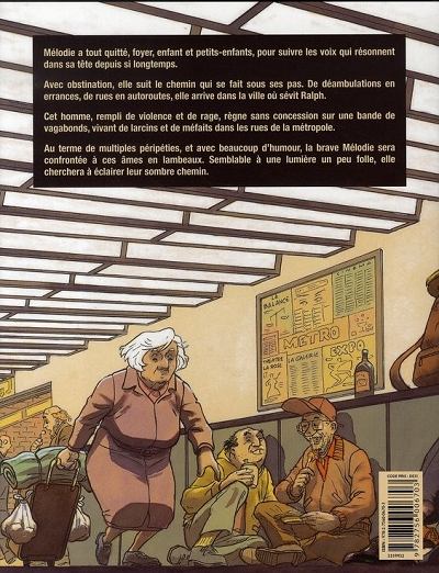 Résumé: Mélodie a tout quitté, foyer, enfant et petits-enfants, pour suivre les voix qui résonnent dans sa tête depuis si longtemps. Avec obstination, elle suit le chemin qui se fait sous ses pas. De déambulations en errances, de rues en autoroutes, elle arrive dans la ville où sévit Ralph. Cet homme, rempli de violence et de rage, règne sans concession sur une bande de vagabonds, vivant de larcins et de méfaits dans les rues de la métropole. Au terme de multiples péripéties, et avec beaucoup d'humour, la brave Mélodie sera confrontée à ces âmes en lambeaux. Semblable à une lumière un peu folle, elle cherchera à éclairer leur sombre chemin.