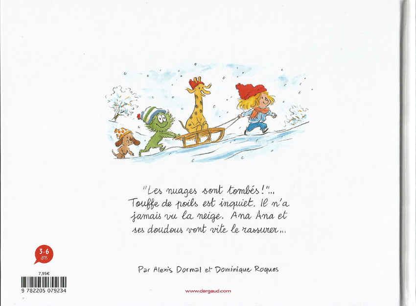 Résumé: Petite sœur du célèbre Pico Bogue, Ana Ana est une petite fille astucieuse, vive et rigolote. Elle vit de grandes aventures avec ses doudous chéris : Touffe de poils, Grizzou, Pingpong, Zigzag, Goupille, Baleineau. Tel un chef d'orchestre, elle mène à la baguette cette petite troupe joyeuse qui la suit dans ses idées ou ses bêtises les plus fantaisistes. Ils découvriront cette fois-ci leur jardin enneigé, et donc la neige : son froissement sous les pas, le froid, la beauté de la nature et bien sûr... les jeux d'hiver !