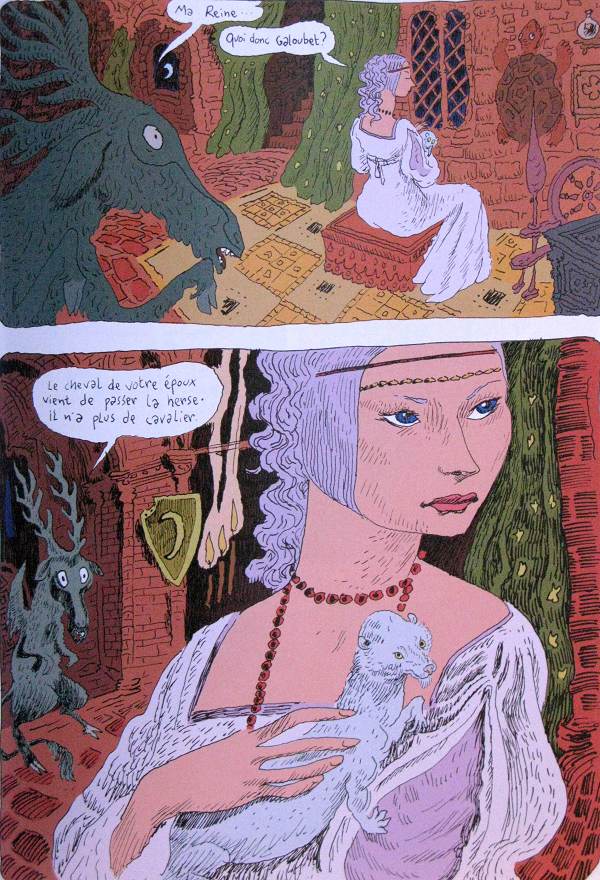 J'ai beaucoup aimé les couleurs et le trait assez "lâche" de Sfar, ainsi que certaines immenses cases qui parcourent l'album. L'univers créé est archi-classique de l'Héroïc Fantasy, mais le ton paisible et les thèmes abordés (religion, croyances, tolérance, amour, fidélité, courage ...) font passer un agréable moment de lecture.