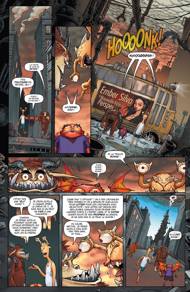 Dans un premier temps, Une toute petite voix se révèle plaisant, rafraichissant et même plutôt amusant, surtout grâce justement au duo que forment l’Élyséenne et le Néfarien qui « conseillent » Théo et dont les accrochages ne manquent pas de faire sourire à défaut d’être réellement savoureux. Cependant, au fil des deux-cent-quatre-vingt-six pages que comptent l’album, la lassitude se fait ressentir. D’abord parce que, au final, les questionnements du personnage principal s’avèrent des plus classiques et sont traités sans véritable innovation. Ensuite, il faut bien avouer que la deuxième partie, située dans le monde parallèle de Perspecta, a quelque chose de poussif, malgré un grand nombre de péripéties et une belle dose d’action. L’impression de surenchère est vive et ne parvient pas à maintenir longtemps la curiosité du début, malgré des protagonistes secondaires pas inintéressants ou des faits subreptices qui mériteraient un développement (certaines réactions du père de Kiori). Le dessin de Micah Gunnell accompagne assez agréablement ce récit touffu. Le trait typique du comic s’avère expressif, tandis que le découpage assure une bonne fluidité et que les cadrages s’avèrent variés et dynamiques. La colorisation de Beth Sotelo enrobe enfin le tout de façon satisfaisante.