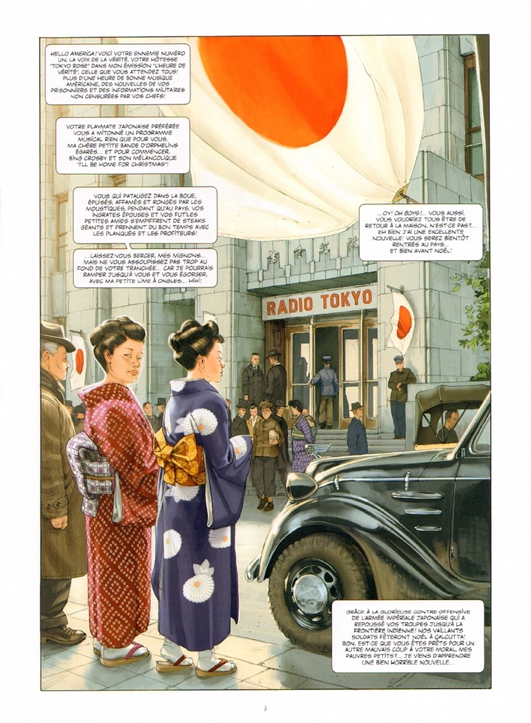 Radio Tokyo est fière d’annoncer aux Américains sa contre-offensive ET la perte du C-46 qui transportait la vedette et championne de tennis Jinx Falkenburg. Cette perte affecte sérieusement le moral des Américains qui s’apprêtent à évacuer d’urgence leur base devant la contre-attaque japonaise. Le C-47 d’Angela doit être détruit faute de pilote pour l’évacuer. Au fait que devient Angela qui s’est écrasée dans la jungle et a réussi à s’en sortir miraculeusement, entraînant avec elle une vedette qui n’est absolument pas préparée à affronter un milieu aussi hostile ? Critique : Non, mais, vous avez vu ces dessins ? Des avions plus vrais que vrais au boulon près ! Des décors à couper le souffle à un athlète olympique affalé dans un fauteuil… Et des personnages aux attitudes telles que, sans avoir fumé sa moquette, on n’en a pas moins l’impression qu’ils bougent ! Hugault est sans conteste un des meilleurs dessinateurs réalistes de sa génération. Quant au scénario de Yann, ce petit salopiot joue avec nos nerfs : pas moyen de savoir ce qu’il s’est passé avec la sœur d’Angela. Espionne traîtresse infâme et méprisable ou pauvre fille sacrifiée par l’état-major pour dissimuler un secret inavouable ? Je vais casser cet insoutenable suspense… Ce n’est qu’au sixième et dernier tome que vous connaîtrez la réponse à cette angoissante question. La bonne nouvelle, c’est qu’Angela va survivre jusque-là ! Non, je ne suis pas devin ! J’ai juste acheté l’intégrale en deux tomes de trois albums chacune. Vous ne m’en voudrez pas si, au moment où je rédige ces lignes, j’ai pris connaissance de l’ensemble de l’histoire ? Si ? Il faut toujours qu’il y ait un rancunier ! Un jaloux ! Pfff ! Mais je m’égare… Côté avions, vous ne serez vraiment pas déçus : P-45, en plus des P-40 déjà bien connus, Spitfire, un Mustang… entre les mains d’un Japonais (Si ! Si !) un Lysander, un étonnant B-25 (G ou H ?) doté d’un canon de 75 mm sous le nez et de quatre mitrailleuses de 0.50" (12,7 mm) implantées dans le nez au-dessus du canon… Et comme la maison ne recule devant aucun sacrifice (surtout s’il s’agit de Japs) il y a même un hélicoptère et un hydravion à très long rayon d’action de la PanAm ! Comment ? Vous n’êtes pas encore sortis l’acheter ? Ah ! Zut ! C’est vrai ! Le couvre-feu après vingt heures dans certaines régions ne vous y autorise pas… Va falloir patienter jusque demain. Mais rien que pour la dernière planche de cet album, votre patience sera récompensée !Le 11/12/2016 à 22:33:18