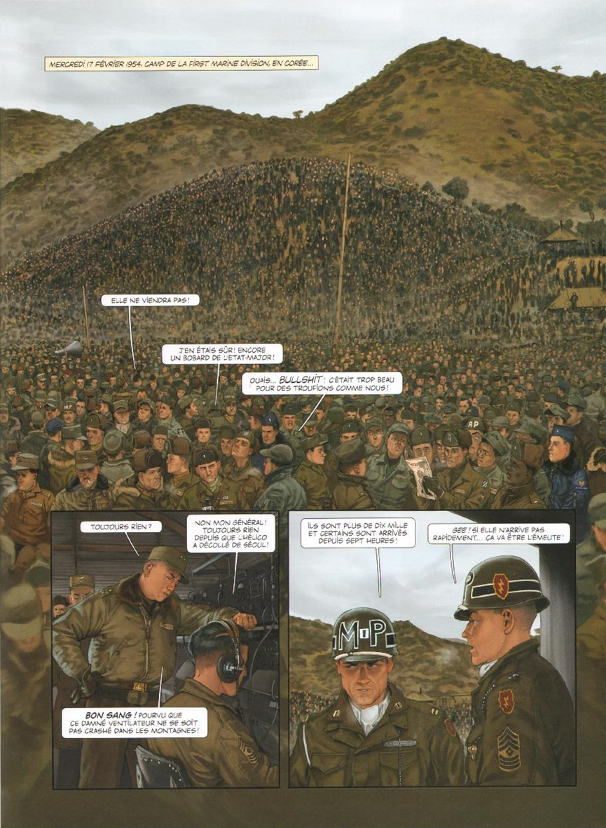 Cet album aurait dû s'appeler : Marilyn chez les GIs. Marilyn fait coucou aux soldats, Marilyn chante, Marilyn embrasse, Marilyn fait du gringue a un pilote ... Bref, cet album est le numéro de LIFE d'avril 1952 en bande dessinée. Et Angel me direz-vous ? Hé bien elle se fait tirer dessus au début de l'histoire sans même s'en être aperçu et se vautre en hélico à la fin de l'album. Un album dédié aux fans de Marilyn ... Poupoupidou. On sent qu'il y a quelque part un contrat qui oblige les auteurs à sortir un album tous les X mois tant celui-ci fait tache et fera date dans les aventures de Angel. Reprenez-vous les gars ou faites mourir Angel ou terminez la série comme les auteurs de GRAND DUC eurent le courage de le faire et qu'on n'en parle plus ! Je vous le dis : Quand au lieu d'acheter l'album d'une série sans même le feuilleter, je commence à regarder le déroulé de l'histoire avant de le reposer ou de passer à la caisse, ça ne sent pas bon et, pour moi, l'abandon, de la série n'est pas loin. Ce fut le cas de Blueberry, Buck Danny, Tanguy & Laverdure, Sillage, Lanfeust, Lefranc et tant d'autres ...Le 14/06/2023 à 14:55:38