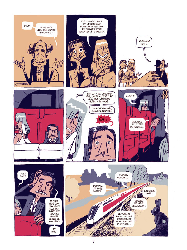 Le dessin, caricatural et relâché, se montre efficace. Dans cette tragédie en trois actes aux airs de boulevards, les interprètes surjouent et les décors dansent. Il est amusant de reconnaître certaines célébrités, notamment Catherine Deneuve et une apparition de Jean Rochefort (chose étrange, puisqu’il est décédé). La colorisation repose sur des teintes crues posées en larges aplats à l’ordinateur; à quelques reprises l’artiste sort ses pinceaux pour ajouter une touche d’aquarelle bien baveuse.