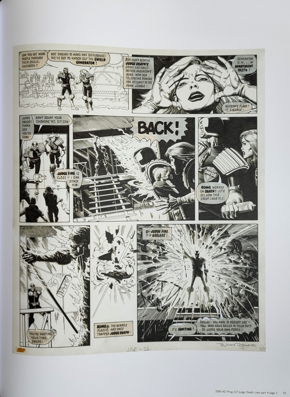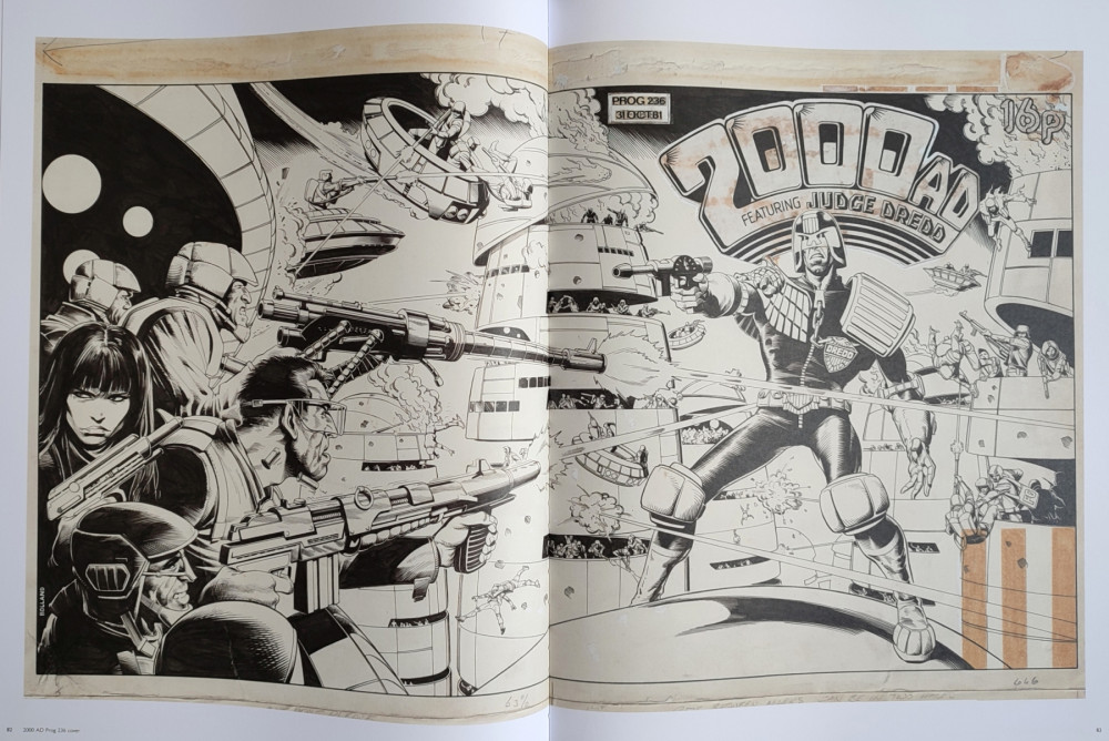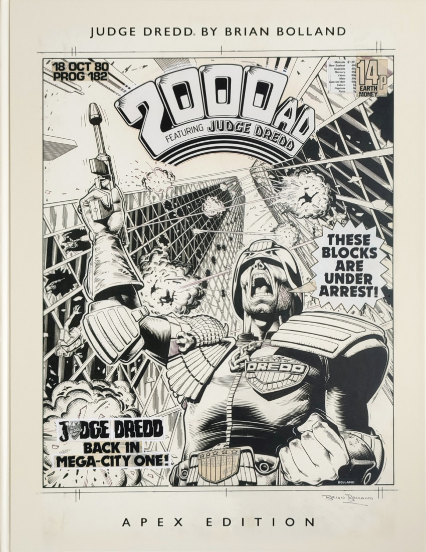 Info édition : Grand format hardcover 15"x19" (env. 371x481mm). Noté First published : February 2022. Introduction de David A. Roach. Les planches et couvertures de Brian Bolland sont en n&b ou couleurs, et tirées de 2000 AD (1977), Judge Dredd (Eagle Comics, 1983) et Action Annual 1980.