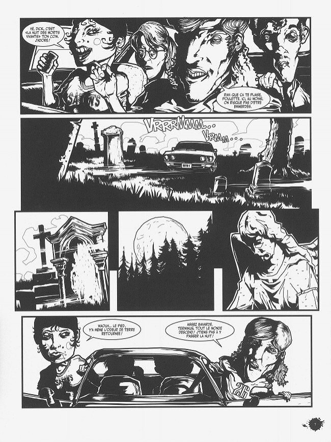 Coups de pelle et de rasoir, morsures de mort-vivants (aquatiques ou non, pour plus d’informations consulter le guide référence en fin d’album), balles perdues, véhicules en perdition, malfrats et forces de l’ordre, l’auteur continue son inventaire à la Prévert du cinéma trash américain et prend un certain plaisir à placer un maximum de références dans un minimum de cases. Cette assemblage disparate est particulièrement jouissif. Après les tarantinesques frères Blackwood et l’implacable shérif B. Justice, c’est au tour de la bande de jeunes - celle qui a toujours la même bonne idée d’aller faire la fête dans cette maison abandonnée au fond de la forêt – au complet avec quarterback gominé et frêles damoiselles court vêtues de se pointer là où les goules se nourrissent. Évidemment, il manquerait quelque chose sans une journaliste de la télévision locale, pas de soucis, Anita Bates la chasseuse de scoops au brushing d'airain est également de la partie.