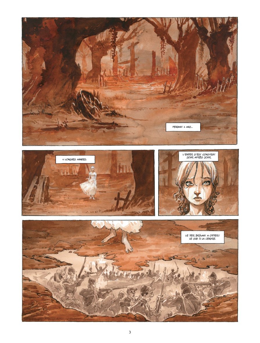 Il y a de l’Ambrose Bierce dans ce « Après l’Enfer » ! La jeune Alice est entre rêves (cauchemars) et confrontation à la vie réelle. Un peu comme dans la sublime nouvelle de Bierce « Ce qui se passa sur le pont de Owl Creek ». L’un se passe pendant la guerre de sécession, l’autre après et bien que le sujet soit différent l’atmosphère tendue est la même. L’histoire débute avec une description des cinq principaux personnages, Dorothy, Alice, Hunk, Zeke et Hickory. Cela commence d'ailleurs très fort avec Zeke qui, tel Inman dans le roman de Charles Frazier « Retour à Cold Mountain », est victime des tunnels des soldats de l’union gorgés de barils de poudre. Le domaine de Dorothy subit les foudres des troupes de Sherman puis de douze opportunistes du sud, Zeke laisse une partie de son visage dans les combats tandis qu' Hickory se voit muni de cornes dus à des morceaux d’obus. Quant à la jeune Alice, elle reste traumatisée par les actes de salopards qui ont tué sa mère et sa grande sœur. Les trois ex confédérés n’ont pas encore rencontré Dorothy et Alice quand ils traversent la Caroline du sud. Entre gamins désespérés qui tentent de les rançonner et soldats de l’union qui veulent les humilier, ils avancent vaille que vaille. Ce ne sont que des personnes du commun non concernées par le XIII ème amendement sur l’esclavage qui pourraient ne souhaiter qu’un retour à la vie précédente. Mais, ils gardent une dent féroce contre le nord qui a pillé les terres, les maisons, les parents, les enfants pour fondre tout l’or trouvé en lingots formant un butin de guerre gigantesque. La capture d’un capitaine nordiste va les aider à se mettre sur la piste de ce trésor. Mais déjà des troupes sont à la poursuite des trois rebs (rebelles sudistes) auxquels se sont joints Dorothy et Alice. La naissance du Klu Klux Klan et leurs exactions concluront de manière horrible ce premier chapitre. Le choix des couleurs entre les différentes scènes transmet magnifiquement les émotions. L’ocre foncé lors de l’attaque d’une maison d’anciens esclaves par le Klan, des couleurs douces pour la nostalgie d’Alice et violettes, comme portant un demi deuil, quand elle est confrontée au Chapelier. Fabrice Meddour joue magnifiquement de celles-ci pour exprimer les émotions des acteurs de l’histoire. Entre douceur et violence, son graphisme ne peut laisser indifférent tout comme cette histoire qui nous montre un autre visage de cette guerre qui fit près d’un million de morts dont 600 000 soldats.Le 25/06/2019 à 13:53:27