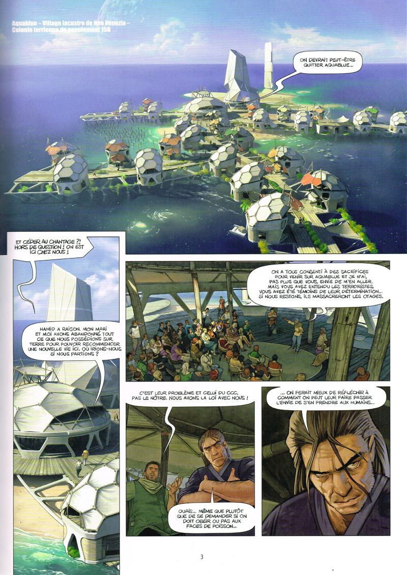 Le dessin de Reno est encore une fois une tuerie, encore au dessus du tome précédent qui plaçait déjà la barre très très haut. Mais on n'aura plus je pense , la dynamique du trait de Vatine, qui a encore prouvé son savoir faire en la matière sur Niourk. Mais c'est splendide, vraiment !! Détails, couleurs, poses, lumières, ça claque !!! Par contre un peu déçu sur les toutes dernières planches de l'album. Un dessin magnifique, très détaillé, que j'avais repéré sur la page facebook de Reno, qu'on retrouve copié-collé-recadré-zoomé pour en faire 3 cases bien distinctes, bah c'est un peu limite. D'autant qu'en plus c'est sans aucun retravail qu'il a été repris. On remarque tout juste un trait blanc dans une bouche pour donner l'impression que le personnage zoomé parle. On a même un morceau de bras de personnage qui traine au recadrage... ça au moins ça aurait pu être effacé numériquement, vu le côté très "chiadé" du reste de l'album... Idem pour la couv, qui finalement, est le mix de 2 cases de l'album. On est loin des autres couvertures du sieur Reno ! J'ai lu que l'album a été accouché dans la douleur, on a l'impression du coup qu'il a en plus été fini à l'arrache... J'imagine que Delcourt a poussé à la roue pour le publier le plus vite possible.... c'est dommage, il méritait mieux ! Reste que ça y est, on commence à avoir de vraies réponses aux questions lancées dans le 1er tome, et l'histoire avance. Ce tome a un bien meilleur rythme que le précédent, et dissipe mes doutes à ce sujet. même si une nouvelle question se pose à propos des "terroristes", qu'il faudra visiblement élucider en 1 tome..... Mais Gan Eden reste un bon , très bon Aquablue, malgré tout. Et - hasard ou non ? - il colle malheureusement très (trop ?) bien à l'actualité noire de ces derniers mois/semaines : migrants, écologie, terrorisme, tout y est....Le 01/12/2015 à 09:57:31