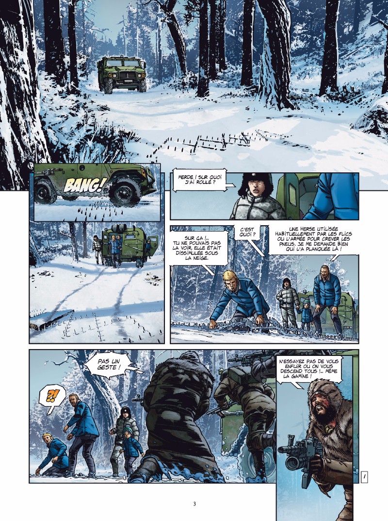 Etrange album pour une étrange série, qui ne sait sur quel pied danser (comme moi, au moment de donner un avis de lecture). On est dans les canons de "série B", à l'instar de "carmen MacCalum" ou "Travis", le dessin est très correct (mention spéciale aux décors, bien meilleurs que la moyenne), les personnages sont assez identifiables visuellement et les couleurs au top. Mais le scénario... C'est le bas qui blesse, le point faible de cette série. Oh, ça bouge, y'a du rythme, mais c'est quand même parfois un peu facile, les personnages se sauvent de situation désespérées un peu trop facilement, et quand ils subissent des choses atroces (une séance de torture, par exemple), ils n'en ont aucune séquelle ! Il n'y a pas de sentiment, je n'ai pas réussi à m'attacher aux personnages, sauf dans cet album, pour une raison que je ne peux révéler. Et les quelques 10 dernières pages de ce tome 8 sont extrêmement bavard, dénotent avec le reste de l'album, et nous tombent un peu des mains. Bref, je ne recommande pas cette série, même si le dessinateur est très bon et le coloriste de talent.BDGest 2014 - Tous droits réservés