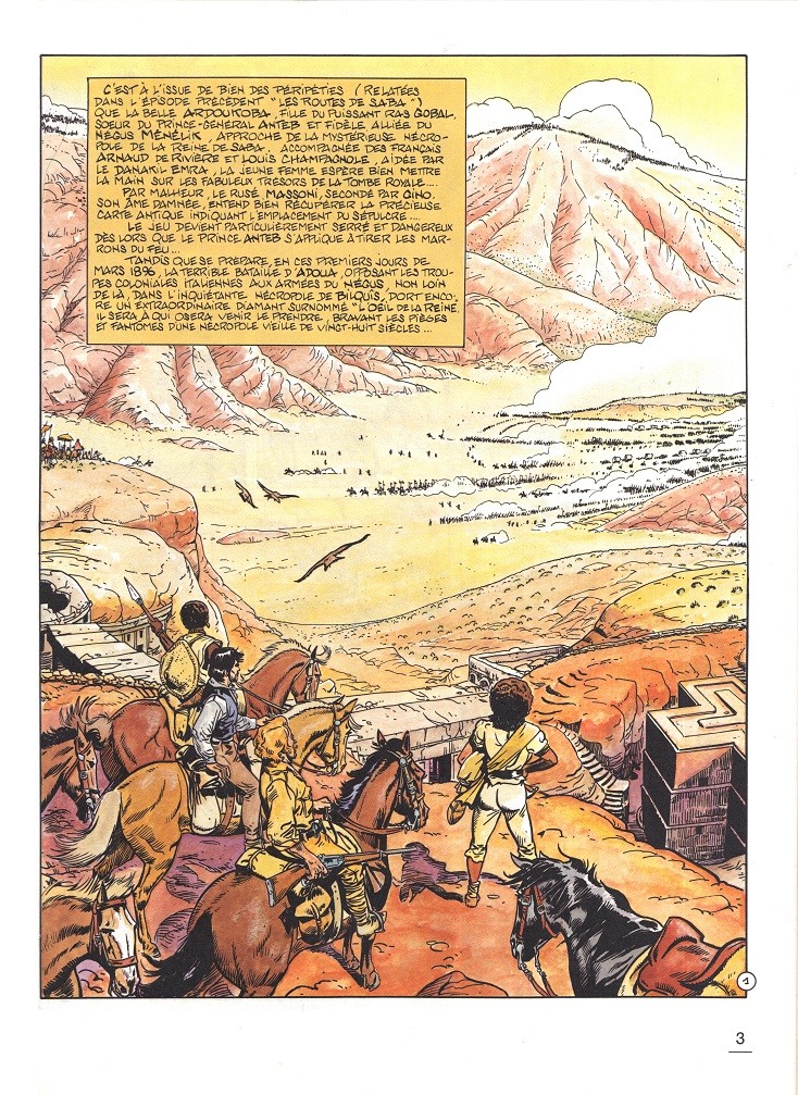 Résumé: C'est sur "Les Routes de Saba" que la belle Ethiopienne Ardoukoba, accompagnée des bouillants Français Arnaud de Rivière et Louis Champagnole, approche de la mystérieuse nécropole de la Reine Bilquîs. Ils espèrent bien mettre la main sur les fabuleux trésors de l'antique tombe royale. Par malheur, le rusé Massoni, un aventurier milanais sans scrupules, s'applique à tirer les marrons du feu... Tout comme le Général-Prince Anteb, un puissant seigneur féodal et frère d'Ardoukoba. Et que penser du Lieutenant Italien Pascolo Parmentieri ?!?... S'agit-il d'un allié ou d'un ennemi ? En ces premiers jours de mars 1896, la terrible bataille d'Adoua, opposant les troupes coloniales italiennes aux armées du Négus Ménélik II, le "Roi des Rois", se prépare fiévreusement. Non loin de là, au cœur de l'inquiétante nécropole de la Reine de Saba, la grande souveraine qui fut l'amante du Roi Salomon, dort encore un extraordinaire diamant. Il sera à qui osera venir s'en emparer, bravant les pièges et fantômes d'un immense tombeau vieux de vingt-huit siècles