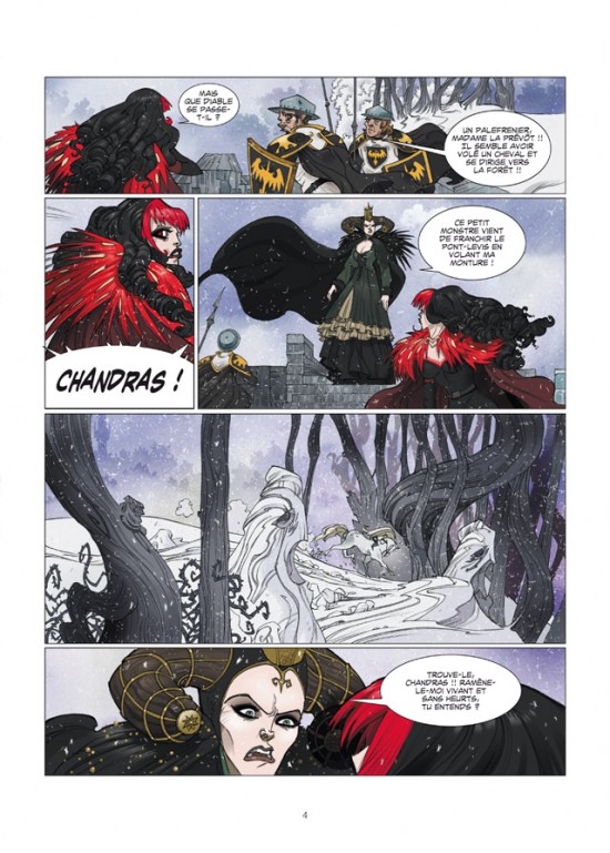 Les premières pages plongent d'emblée le lecteur dans une ambiance mixte, entre tonalité enfantine et noirceur, la reine noire et son prévôt en chasse s'opposant à l'innocence apparente des jeunes héros. La suite confirme cette ambiguïté. L'atmosphère sombre est soulignée par les paysages de désolation aux teintes brunes ou enneigés, tandis que l'aspect dessin animé est mis en évidence par des couleurs plus vives, orange et rouges.