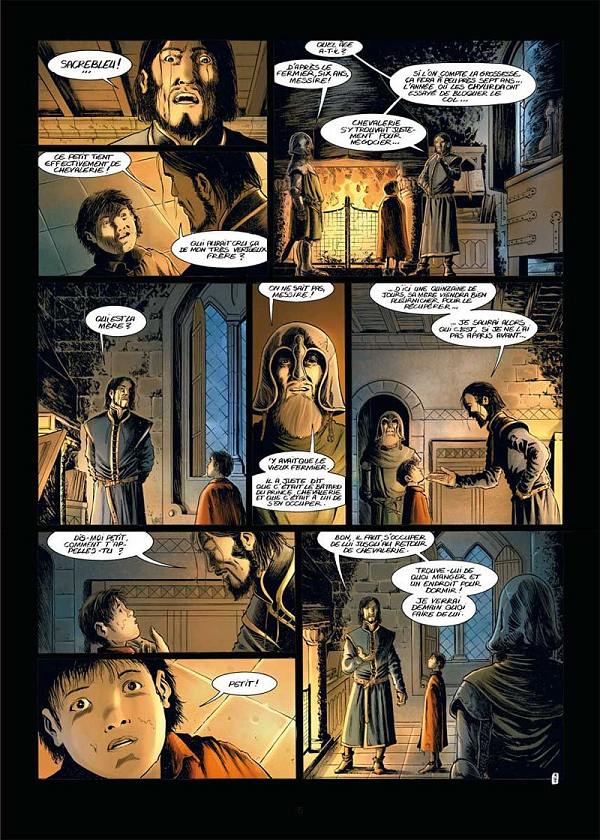 Mais la plus grande déconvenue provient du graphisme et des couleurs. La couverture extrêmement bien léchée de Didier Graffet évoque une ambiance qu’on ne retrouve absolument pas à l’intérieur. Le dessin de Laurent Sieurac (Les Princes d’Arclan, La Geste des Chevaliers Dragons, Les Prophéties Elween), totalement différent, paraît presque sans vie et trop lisse en comparaison. Si l’univers fantastique aux accents médiévaux qu’il imagine convainc, la similitude entre plusieurs personnages masculins – Burrich et Vérité en particulier – empêche de les distinguer clairement, quand la teinte de leurs cheveux ne varie pas d’une scène à l’autre. En outre, comment ne pas déplorer la mise en couleurs plate et figée de Fabien Alquier (Les Princes d’Arclan, Nina Tonnerre, Marie des Loups) ? Certains de ses effets sont par ailleurs gâchés par les hachures sombres du dessinateur pour accentuer et souligner les ombres. Ces traits noirs joints aux aplats rongent les visages quand ils ne les déforment pas et font double emploi. Les pages exemptes de ce défaut passent bien mieux que les autres. Notons également que Laurent Sieurac livre quelques paysages réussis et fouillés, à l’image du Bourg de Castelcerf s’éveillant à l’aube ou du château sur lequel souffle une tempête de neige.
