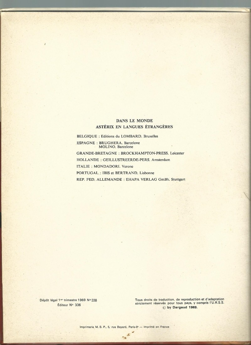 Info édition : DL : 1er trimestre 1969, Editeur N° 336. Cinq imprimeurs pour l’EO Dargaud : DMC N° 934 ; MBP N° 338 ; SAINT-HILAIRE OFFSET N° 3 ; … N° 286 ; … N° 2120. La mention "DARGAUD SA EDITEUR" est dans un rectangle jaune.