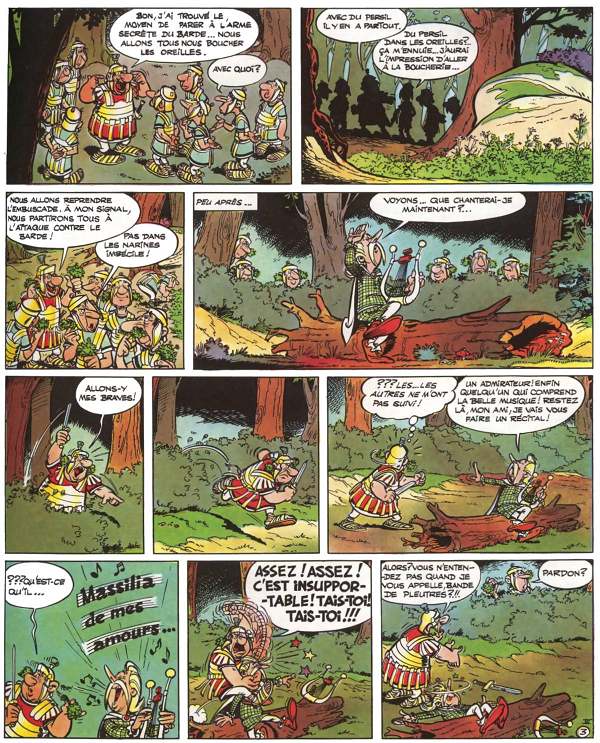 Avec ce quatrième opus, les aventures d’Astérix commencent à prendre une dimension très intéressante, voire totalement loufoque. Pour une fois, c’est le barde Assurancetourix qui est mis en avant. Son enlèvement donne lieu à une scène très drôle. Astérix et Obélix partent donc à Rome pour le délivrer et cela donne lieu à d’excellents moments, notamment quand ils choisissent la carrière de gladiateurs, auprès de Caïus Obtus. La course de chars est de toute beauté. On notera également la présence pour la première fois des pirates. Ceux-ci sont la caricature de héros de la série de Jean-Michel Charlier et Victor Hubinon : Barbe Rouge, personnage que l’on retrouve associé à Triple pattes, le spécialiste des citations latines et Baba qui ne prononce pas les « r ». La vie à Rome donne lieu à de bons gags, comme celui des relations de voisinage dans les insulae, ou encore la présence « enjouée » de Brutus auprès de César.Le 01/07/2020 à 11:08:50