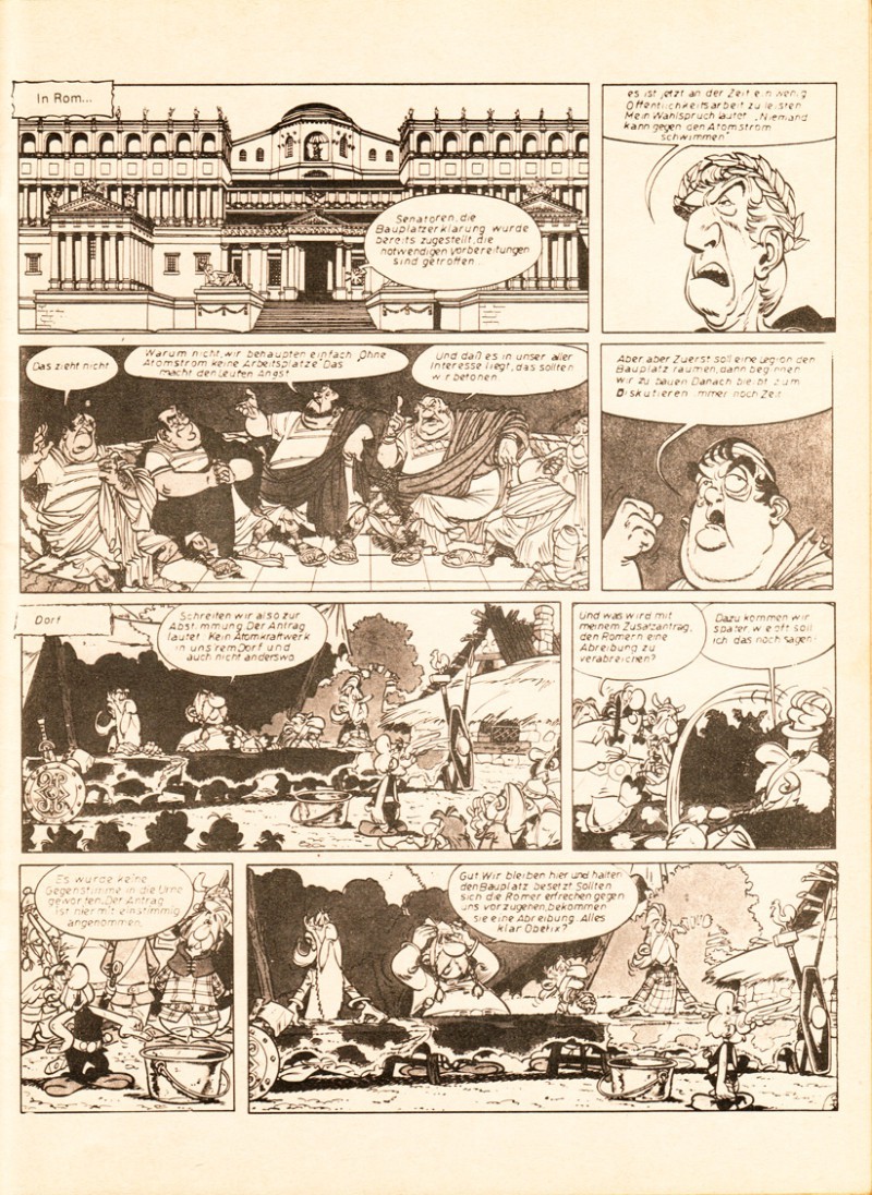 Résumé: Manifeste anti-nucléaire allemand du début des années 80 vendu au profit de toutes les associations agissant contre l'installation ou l'extension de centrales nucléaires en Allemagne. Les dessins sont tirés de tous les albums d'Astérix et remontés avec de nouveaux textes.