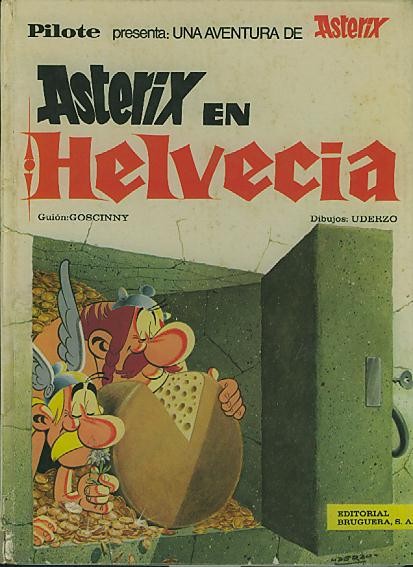 Al igual que en sus viajes por otros países, los helvecios aparecen caracterizados por varios tópicos: su obsesión por la limpieza (lo que ocasiona la ira de Cayo Diplodocus, que no concibe un banquete divertido si no es también grasiento), la precisión de sus relojes (aunque aún no son de cuco, sino de arena), el queso con agujeros, el secretismo de sus bancos, su afición al montañismo y su obsesión por mantener la neutralidad en la mayoría de los conflictos y auxiliar a los heridos de todos los bandos (hasta el punto de que, cuando por fin se deciden a enfrentarse a los romanos, les curan las heridas). También aparece un edificio monumental donde se reúnen los representantes de todas las tribus de Centroeuropa para discutir sobre política (aunque la mayoría de los presentes se acaba durmiendo), un antiguo precedente de las Naciones Unidas.