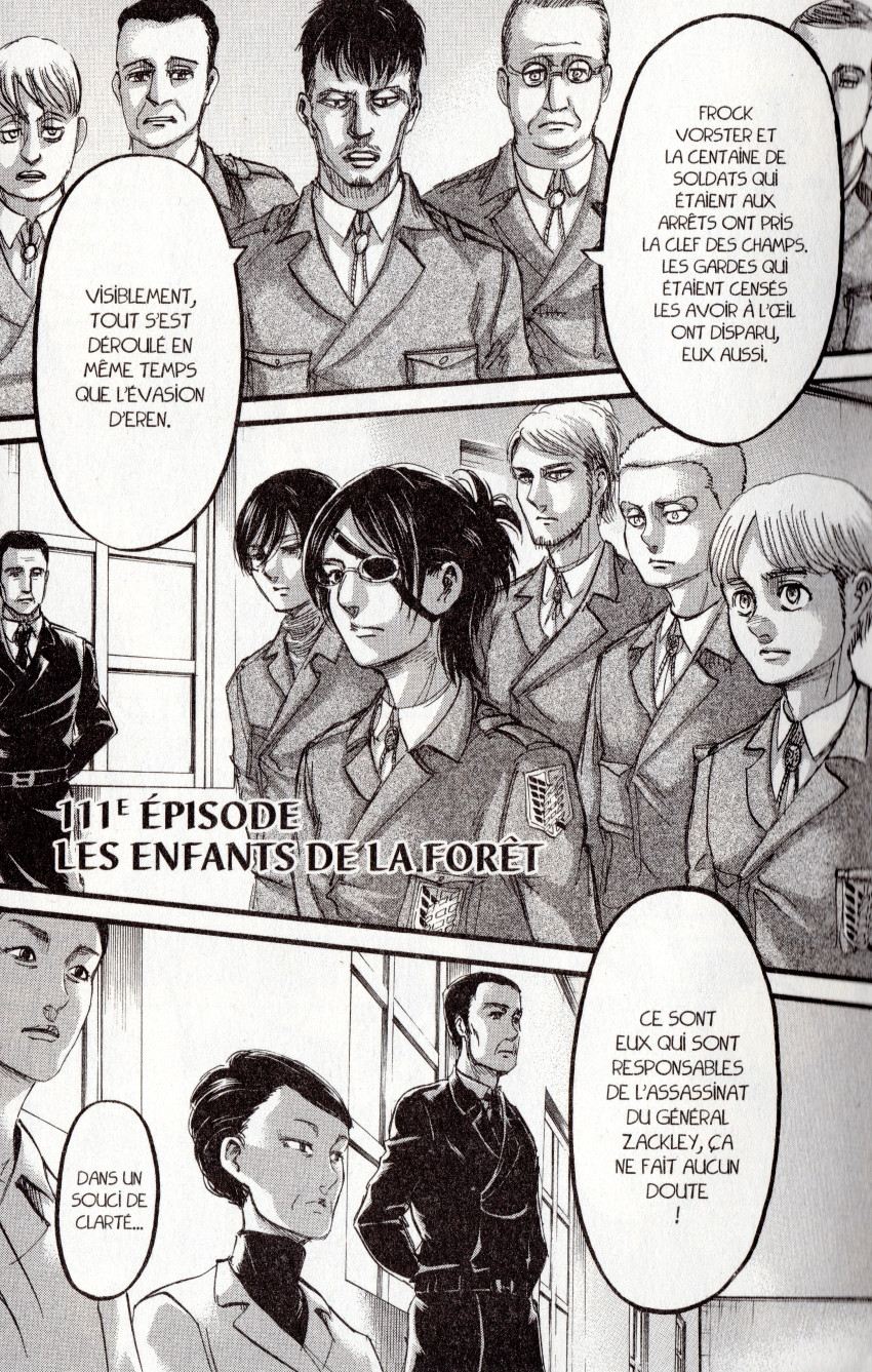 Résumé: Théoriquement, l'arrivée de Sieg dote l'Île du Paradis de la puissance du "Grand Terrassement", mais l'armée est méfiante : peut-on vraiment être sûr qu'Eren n'est pas manipulé par son demi-frère ? Pour parer à tout risque, les transfuges Mahr sont emprisonnés. Cependant, une partie des troupes et de la population est très insatisfaite de la situation. Alors que la grogne monte, Eren passe à l'action.
