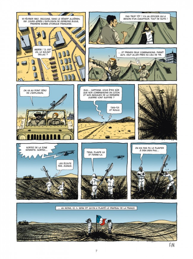 a bombe atomique est un sujet tabou, et les conditions dans lesquelles la France s’est dotée de cette ‘arme ultime’ restent entourées de mystère. Partant de ce constat, Albert Drandov et Franckie Alarcon ont pris le parti de récolter différents témoignages et, sous forme de bande dessinée, de réaliser une sorte de documentaire sur le sujet.