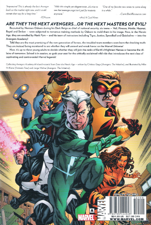 Résumé: Recruited by Norman Osborn during his Dark Reign, six teens — Veil, Finesse, Mettle, Hazmat, Reptil and Striker — were subjected to torturous training methods to mold them in Osborn's image. Now, in the Heroic Age, they are enrolled by Hank Pym and his team of instructors — including Tigra, Justice, Speedball and Quicksilver — into the Avengers Academy! Told they are the most promising of the new generation of heroes, the troubled team soon learns the shocking truth: They are instead being monitored to see whehter they will unravel and wreak havoc on the Marvel Universe! Now, it's up to each young adult to decide whether they will join the ranks of Earth's Mightiest Heroes, or instead become the villains of tomorrow.
