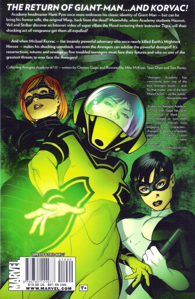 Résumé: Hank Pym returns to his greatest role! That's right, Giant-Man is back! Then, the Avengers Academy students take on a mission of vengeance against the Hood, and Finesse goes off in search of the man who could be her father: Taskmaster! But everything changes when Korvac returns and defeats the Avengers. Now, the world's only hope lies with the Avengers Academy students, who have been aged to adulthood! With time manipulated, the team gets a glimpse of what the future might hold for them. For some, it's a revelation; for others, a life sentence! Can they overcome their personal demons and master unfamiliar abilities in time to defeat a foe powerful enough to conquer Earth's Mightiest Heroes? And if that wasn't enough, enter the Young Allies, the Initiative - and the Sinister Six!