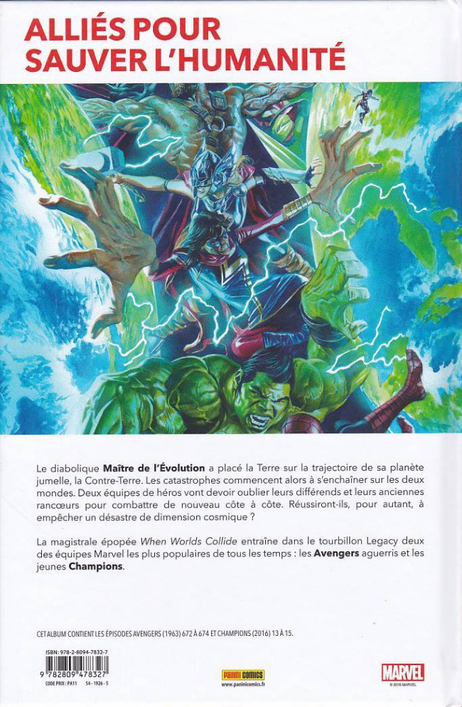 Résumé: Le diabolique Maître de l'Évolution a placé la Terre sur la trajectoire de sa planète jumelle, la Contre-Terre. Les catastrophes commencent alors à s'enchaîner sur les deux mondes. Deux équipes de héros vont devoir oublier leurs différends et leurs anciennes rancoeurs pour combattre de nouveau côte à côte. Réussiront-ils, pour autant, à empêcher un désastre de dimension cosmique ? La magistrale épopée When Worlds Collide entraîne dans le tourbillon Legacy deux des équipes Marvel les plus populaires de tous les temps : les Avengers aguerris et les jeunes Champions.