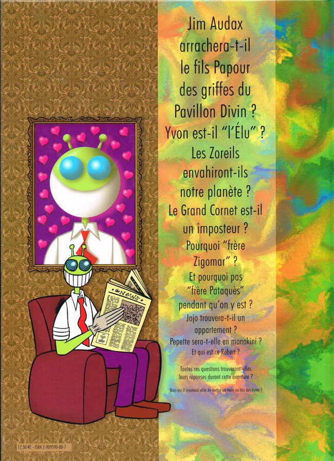 Résumé: Jim Audax arrachera-t-il le fils Papour des griffes du Pavillon Divin ? Yvon est-il "l'Élu" ? Les Zoreils envahiront-ils notre planète ? Le Grand Cornet est-il un imposteur ? Pourquoi "frère Zigomar" ? Et pourquoi pas "frère Pataquès" pendant qu'on y est ? Jojo trouvera-t-il un appartement ? Pepette sera-t-elle en monokini ? Et qui est ce Robert ?