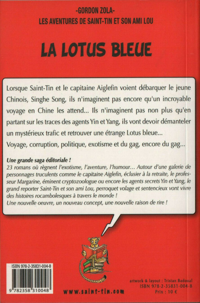 Résumé: Lorsque Saint-Tin et le capitaine Aiglefin voient débarquer le jeune chinois, Singhe Song, ils n’imaginent pas encore qu’un incroyable voyage en Chine les attend... Ils n’imaginent pas non plus qu’en partant sur les traces des agents Yin et Yang, ils vont devoir démanteler un mystérieux trafic et retrouver une étrange Lotus bleue... Voyage, corruption, politique, exotisme et du gag, encore du gag...