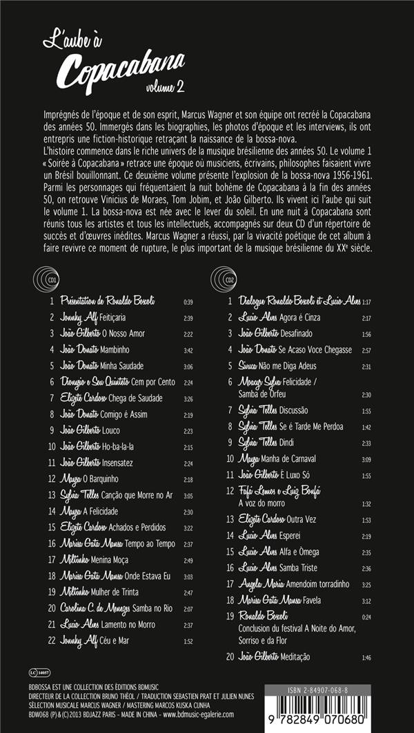 Résumé: Imprégnés de l'époque et de son esprit, Marcus Wagner et son équipe ont recréé la Copacabana des années 50. Immergés dans les biographies, les photos d'époque et les interviews, ils ont entrepris une fiction-historique retraçant la naissance de la bossa-nova. L'histoire commence dans le riche univers de la musique brésilienne des années 50. Le volume 1 « Soirée à Copacabana » retrace une époque où musiciens, écrivains, philosophes faisaient vivre un Brésil bouillonnant. Ce deuxième volume présente l'explosion de la bossa-nova 1956-1961. Parmi les personnages qui fréquentaient la nuit bohème de Copacabana à la fin des années 50, on retrouve Vinicius de Moraes, Tom Jobim, et João Gilberto. Ils vivent ici l'aube qui suit le volume 1. La bossa-nova est née avec le lever du soleil. En une nuit à Copacabana sont réunis tous les artistes et tous les intellectuels, accompagnés sur deux CD d'un répertoire de succès et d'oeuvres inédites. Marcus Wagner a réussi, par la vivacité poétique de cet album à faire revivre ce moment de rupture, le plus important de la musique brésilienne du XXe siècle.