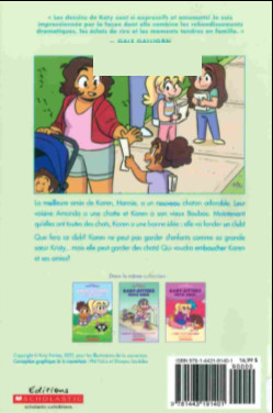 Résumé: On retrouve dans cet opus Karen Brewer, véritable casse-cou de près de sept ans, qui espère réussir à tisser des liens entre Hannie et Amanda, ses deux amies qui ne s'aiment pas beaucoup. Pour ce faire, l'héroïne décide de miser sur ce qu'elles ont en commun toutes les trois, à savoir leur amour pour les chats. Inspirée par l'expérience de sa demi-soeur Kristy, qui lui explique comment elle a fondé le club des Baby-Sitters, Karen met sur pied le club des Minous mignons, qui offre ses services de gardiennage de chats dans tout le quartier. Or, rien ne se passe comme prévu. Non seulement le téléphone ne sonne pas, mais les trois membres se disputent la présidence. Karen subit par ailleurs les foudres de son amie Nancy, qui n'a pas de chat et qui lui en veut terriblement de ne pas pouvoir faire partie du club.